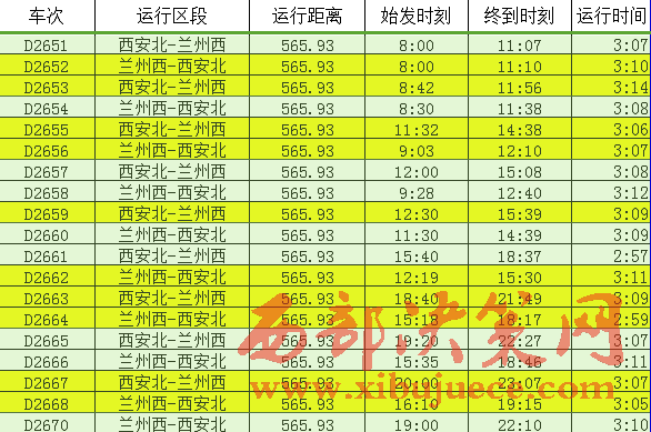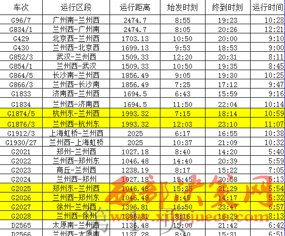 從寶蘭高鐵列車開行方案來看,蘭州西至北京西開行動車組列車1對,為列車雙向?qū)﹂_,共計(jì)運(yùn)行1699公里,9:53從蘭州西站始發(fā),18:53達(dá)到北京西站,車次為 G430次,運(yùn)行時(shí)間9小時(shí)整;10:50從北京西站始發(fā),20:00到達(dá)蘭州西站,車次為 G429次。蘭州西至廣州南開行動車組列車1對,為列車雙向?qū)﹂_,共計(jì)運(yùn)行2474.7公里,8:05從蘭州西站始發(fā),20:26到達(dá)廣州南站,車次為 G834/1次;8:55從廣州南站始發(fā),19:23到達(dá)蘭州西站,車次為 G96/7次,運(yùn)行時(shí)間10小時(shí)28分。蘭州西至上海虹橋站開行動車組列車1對,為列車雙向?qū)﹂_,共計(jì)運(yùn)行2025公里,10:37從蘭州西站始發(fā),21:09到達(dá)上海虹橋站,車次為 G1930/27次,運(yùn)行時(shí)間10小時(shí)32分;6:17從上海虹橋站始發(fā),16:55到達(dá)蘭州西站,車次為 G1912/3次。