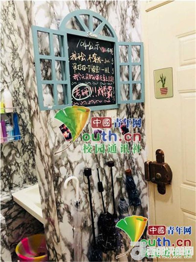 記者了解到,華麗變身后的宿舍,除了效果讓人驚艷不已外,還有許多小細(xì)節(jié)同樣讓人覺(jué)得很暖心。在門口處有一個(gè)小黑板,上面寫著室友的留言和一些鼓勵(lì)的話語(yǔ);進(jìn)門的地方專門騰出一塊空間,放雨傘、鑰匙等一些物品。