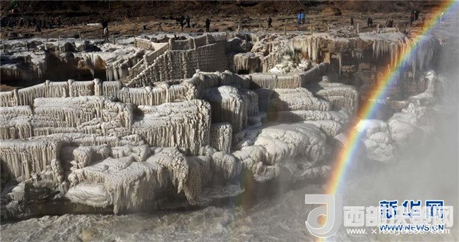 這是12月17日在山西吉縣黃河壺口瀑布拍攝的冰瀑彩虹景觀。當(dāng)日,黃河壺口瀑布出現(xiàn)彩虹景觀。壺口瀑布兩岸姿態(tài)萬(wàn)千的冰瀑,與瀑布上空的彩虹相映成趣,美不勝收。(饒北成 攝)