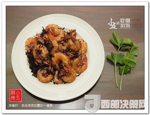 傳統(tǒng)的茶香蝦,蝦要炸得酥脆的,茶葉也是要炸得酥脆的,自家吃的還是講究少油健康,茶葉改為炒的,但還是一樣的好吃,蝦是外酥里嫩。兒子表揚我做蝦的手藝已經超越了許多餐廳。