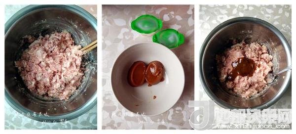 3、將變成漿糊的濃湯寶調(diào)入肉餡里;