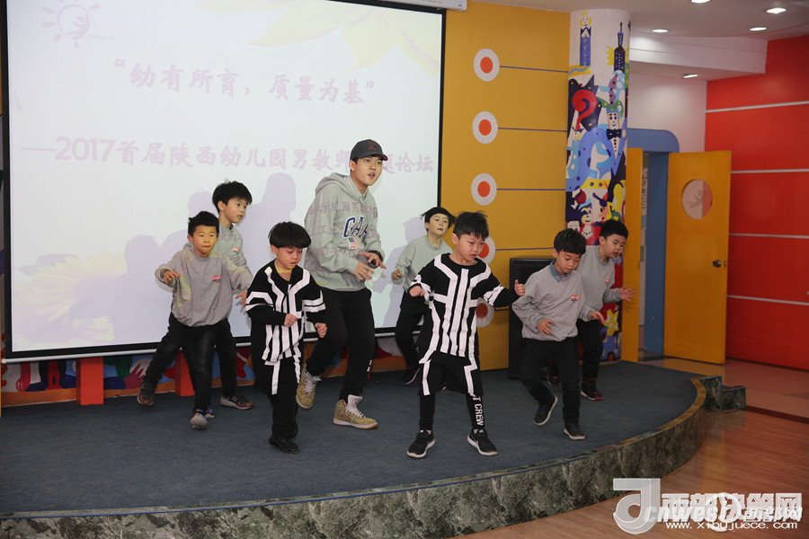 論壇上,西安市浐灞第二幼兒園的謝曉鳴和孩子們帶來的街舞表演點(diǎn)燃了全場(chǎng),讓大家感受到幼兒園男教師的熱情和激情;陜西師范大學(xué)幼兒園的韓凱帶來的鋼琴演奏《一壺美酒》傳達(dá)了深切的情感,讓人回味無窮;西航天鼎保育院的趙棟用挺拔健美的身姿表演的拉丁串燒,展現(xiàn)了生命自信的力量;電信十所幼兒園的孫博一只單簧管演奏,吹出了男教師細(xì)致柔情的一面;西安市雁塔區(qū)第一幼兒園的陳曉峰演唱的《祖國,慈祥的母親》讓我們領(lǐng)略了幼兒園男教師專業(yè)的唱功和對(duì)職業(yè)的自信;西北工業(yè)大學(xué)幼兒園教師董樂帶領(lǐng)小朋友展示了動(dòng)感的啦啦操和籃球活動(dòng),場(chǎng)上的小運(yùn)動(dòng)員自信的運(yùn)球、上籃、投球,矯健的身姿,專注的表情,默契的配合,感染著在場(chǎng)的每一位教師;西安市第五保育院肖波和陜西睿星體育一群陽光帥氣的男教師組織的趣味體能游戲?qū)⒒顒?dòng)氣氛推向了高潮。