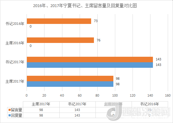 據(jù)統(tǒng)計,2017年,人民網(wǎng)網(wǎng)友分別給寧夏黨委書記、政府主席公開留言143條和98條,同期增長幅度較大,其中書記留言量增長49%。值得點贊的是,書記、主席全年的回復率達100%,各項數(shù)據(jù)均創(chuàng)新高。