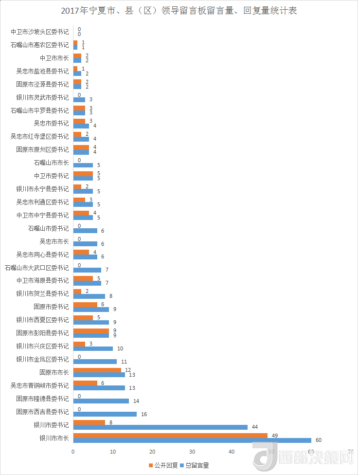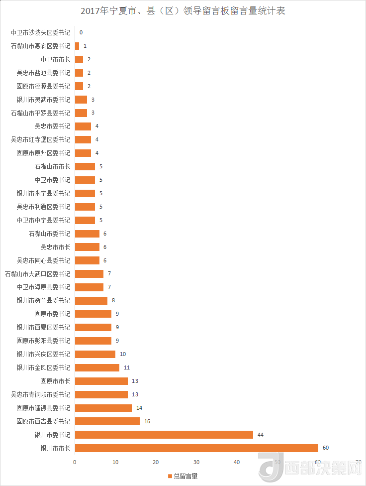 銀川市市長、銀川市委書記、固原市西吉縣委書記的留言量分別以60、44、16條進入前三名。盡管網(wǎng)民給固原市西吉縣委書記的留言量進前三,但回復量卻為0。