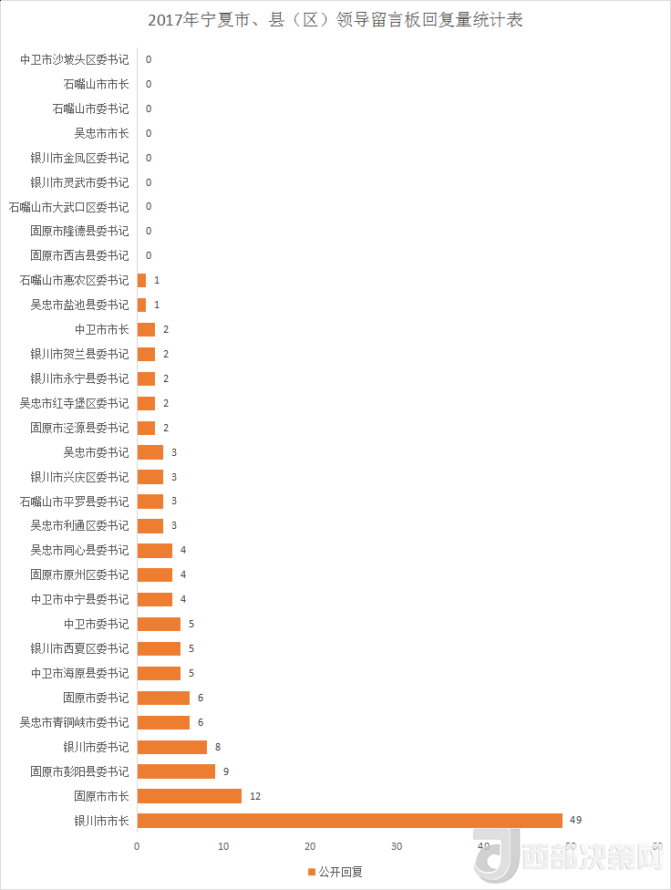 銀川市市長以49條回復量高居榜首,是第二名固原市市長回復量的三倍多。