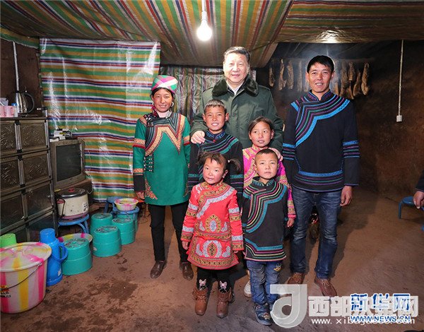 這是習近平在涼山彝族自治州昭覺縣三岔河鄉(xiāng)三河村同貧困戶吉好也求一家合影。記者 謝環(huán)馳 攝