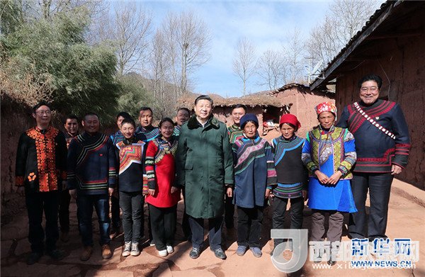 這是習近平在涼山彝族自治州昭覺縣三岔河鄉(xiāng)三河村貧困戶節(jié)列俄阿木家同鄉(xiāng)親們合影。記者 謝環(huán)馳 攝