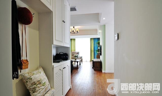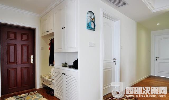 進門玄關,貼壁做了一排的櫥柜,模仿國外家居設計,做了一個連體的矮柜換鞋凳,上方安裝掛鉤吊衣服。