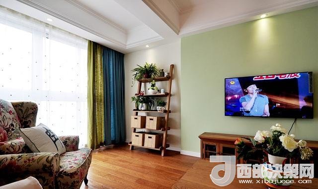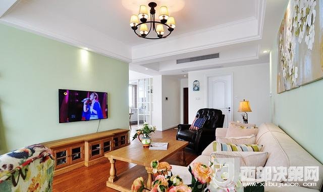 沙發(fā)墻上的油畫和茶桌刪搞得插花,遙相呼應,給人清新自然之感。