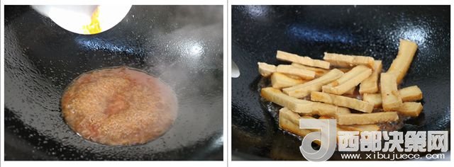 4.少許油 加入適量清水,辣醬(咸辣味,無蒜)、白糖放入鍋里攪拌勻。加入豆腐收汁,至半收汁時,湯汁和豆腐一起 鏟起備用。
