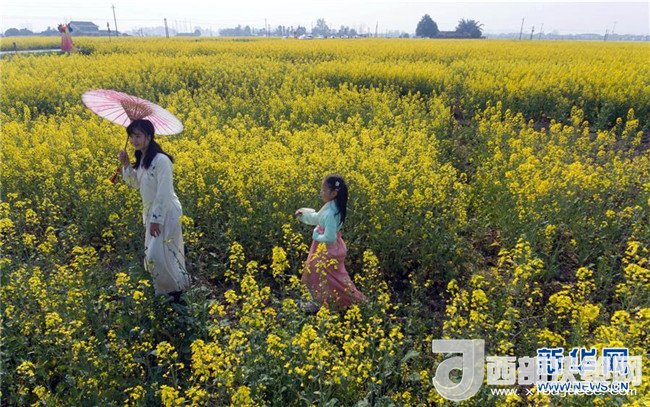 3月11日,在成都邛崍市冉義鎮(zhèn),來自成都的趙梓蓉帶著女兒在油菜花地里賞花拍照。