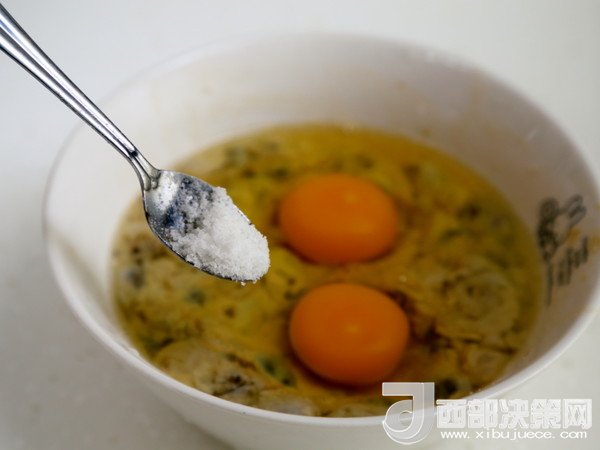 4.用筷子將雞蛋打散,加入切碎的蒜苗,然后全部拌勻備用。