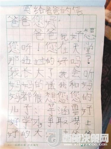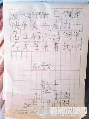 “爸爸您好。爸爸我好想您呀!您在天堂那邊過的好嗎?我長大了,我會(huì)聽媽媽的話。我和媽媽都想您。您的兒子芋涵要好好學(xué)習(xí),爭取考上好的大學(xué)。請爸爸放心吧。我會(huì)健康快樂成長為一名工程師。請爸爸在天堂看著我吧。此致,敬上。兒子芋涵。2018年1月11日寫。”