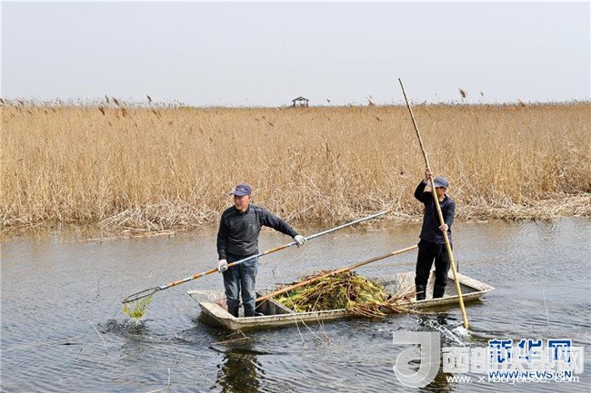 工人在白洋淀景區(qū)內(nèi)清理漂浮物(3月29日攝)。新華社記者 牟宇 攝