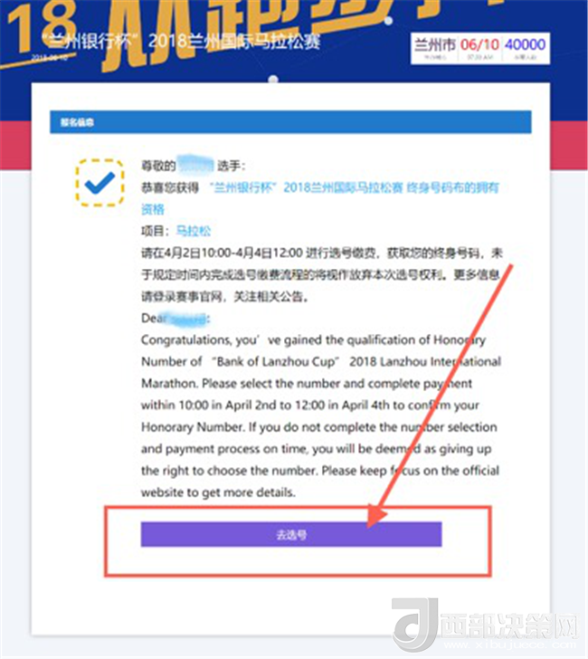 西部決策網(wǎng)—西部大開發(fā)訊(杜杰 帥華鋒)“蘭州銀行杯”2018蘭州國際馬拉松賽預報名工作已于3月25日15:00截止,現(xiàn)已全面進入資質審核階段,在所有成功預報名的選手中,終身號碼(含歷屆與2018新進)擁有者可于4月3日10:00-4月5日12:00通過官網(wǎng)完成自主選號并繳費;馬拉松項目直通選手(不含組委會特邀及專業(yè)運動員,詳見官網(wǎng)報名須知)也可于4月6日10:00-4月8日12:00完成自主選號并繳費。具體規(guī)則及流程如下: