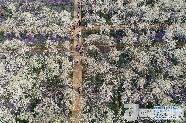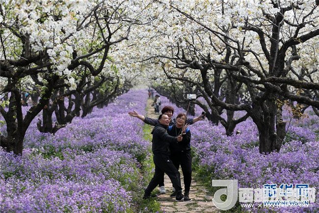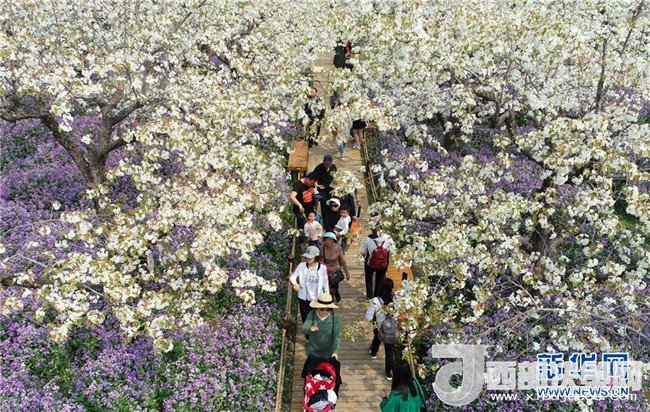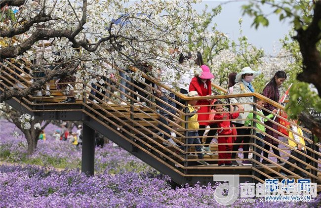 清明時(shí)節(jié),在江蘇省宿遷市三臺(tái)山森林公園梨香滿園景區(qū),白色的梨花和紫色的二月蘭爭相綻放,吸引眾多游客前來踏青賞花。 新華社發(fā)(周國強(qiáng) 攝)