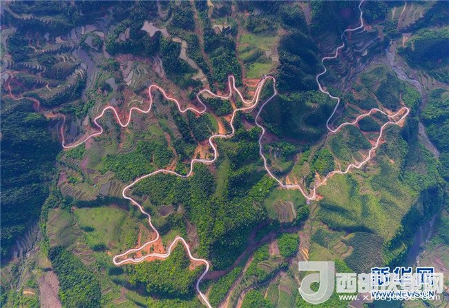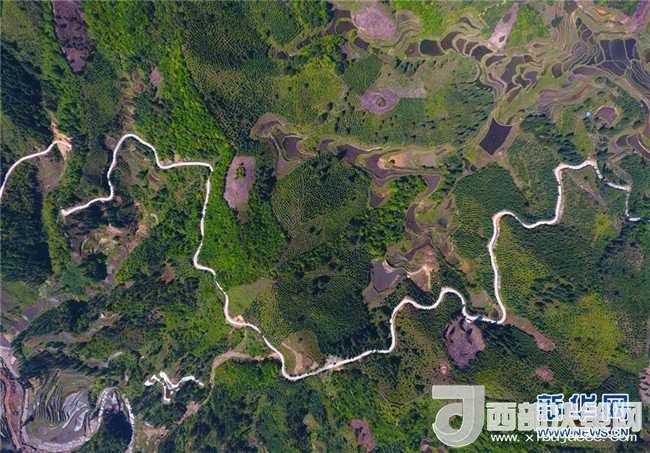 這是借助無人機拍攝的融水苗族自治縣桿洞鄉(xiāng)花孖村公路(4月17日攝)。