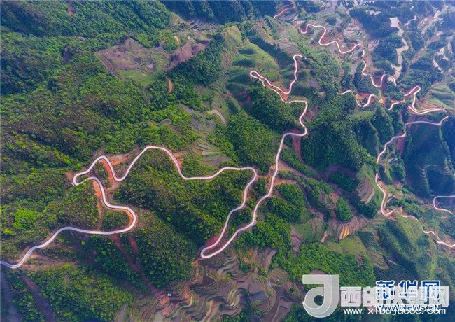 這是借助無人機拍攝的融水苗族自治縣桿洞鄉(xiāng)黨鳩村公路(4月17日攝)。