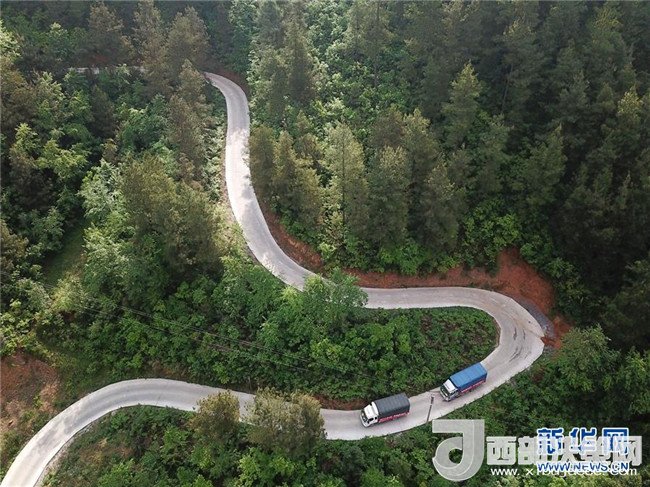 4月22日,幫助吉雪家搬家的貨車行駛在鄉(xiāng)村公路上(無人機(jī)拍攝)。