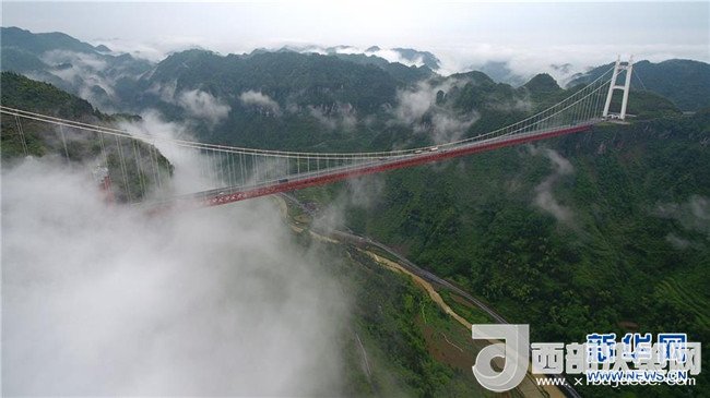 5月1日,湖南省吉首市矮寨大橋周邊云霧繚繞。當(dāng)日,吉首市雨過(guò)天晴,山區(qū)云霧縹緲,變幻多姿。新華社發(fā) 龍恩澤 攝