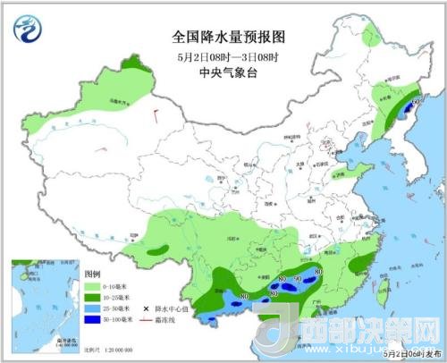 5月2日08時至3日08時,吉林東部、湖南南部、貴州南部、廣西大部、云南南部等地的部分地區(qū)有中到大雨,其中,吉林東部、湖南南部、貴州東南部、廣西北部和西部、云南南部等地局地有暴雨(50~90毫米);上述局部地區(qū)將伴有短時強降水等強對流天氣。新疆北部和南疆盆地東部、內(nèi)蒙古中西部、遼東半島等地有4~6級風;新疆南疆盆地等地的部分地區(qū)有揚沙或浮塵天氣(見圖1)。