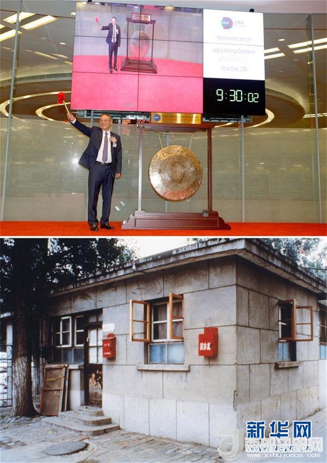 拼版照片:上圖為2015年6月29日,聯(lián)想控股在香港整體上市,聯(lián)想控股董事長(zhǎng)、聯(lián)想集團(tuán)創(chuàng)始人柳傳志敲鐘;下圖為1984年,柳傳志等11位科研人員在一間不足20平方米的小平房(中科院計(jì)算所傳達(dá)室)中創(chuàng)辦了聯(lián)想。 新華社發(fā)