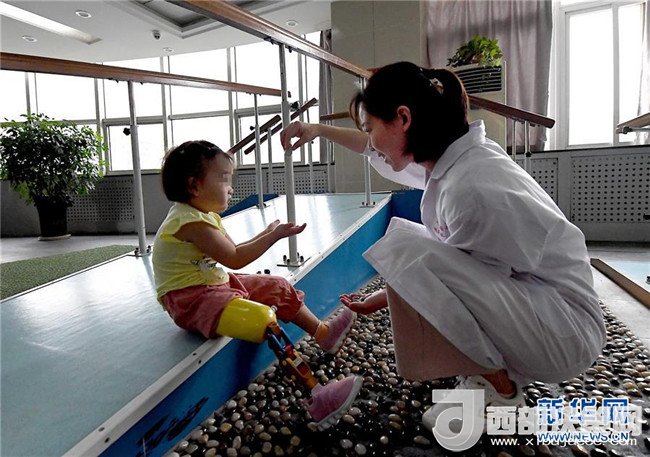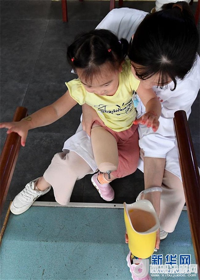 5月29日,笑笑在假肢康復(fù)訓(xùn)練指導(dǎo)師袁紫薇的陪護(hù)下練習(xí)獨(dú)立行走。