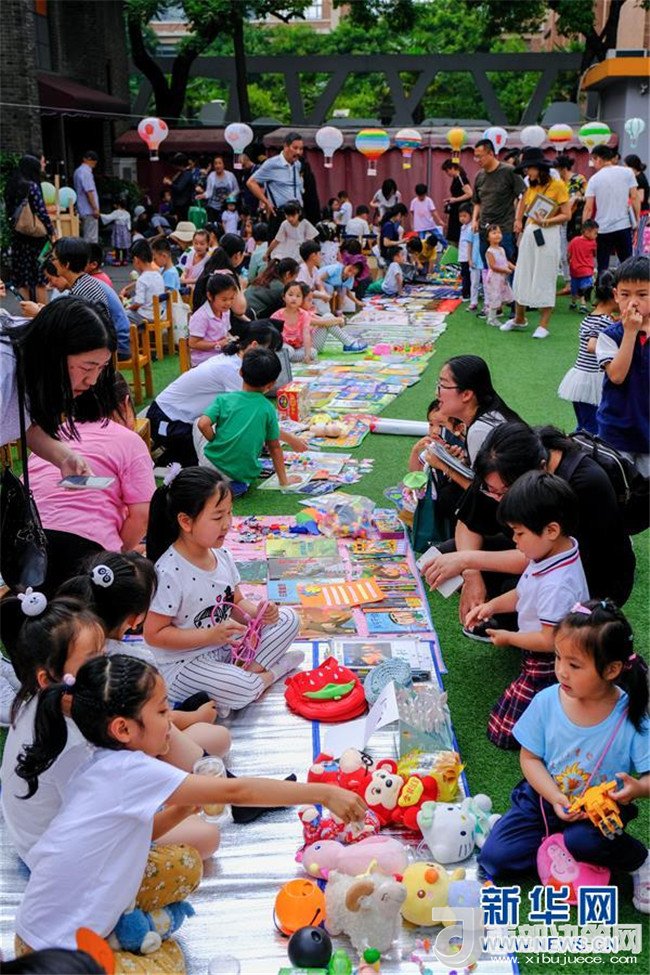6月4日,孩子和家長們在校園“跳蚤市場”中買賣玩具和書籍。新華社記者 徐昱 攝