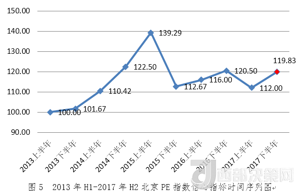 2017年下半年北京PE指數(shù)為120.25,環(huán)比增長(zhǎng)1.18%,同比下降3.03%。從指數(shù)走勢(shì)看,2017年下半年北京PE指數(shù)較上半年穩(wěn)步回升,仍處于高位。
