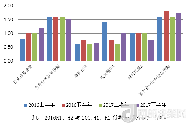 相較于募資、投資、退出指標(biāo)的微降,機(jī)構(gòu)信心指標(biāo)上漲顯示投資人對(duì)2018年北京地區(qū)股權(quán)投資發(fā)展充滿了信心。從預(yù)期分項(xiàng)指標(biāo)看,雖然指標(biāo)所處水平顯示投資人認(rèn)為2018年上半年行業(yè)總體仍將保持平穩(wěn)發(fā)展態(tài)勢(shì),對(duì)自身業(yè)務(wù)發(fā)展預(yù)期、募資預(yù)期、投資預(yù)期保持中性,但是行業(yè)總體評(píng)價(jià)、被投企業(yè)運(yùn)營(yíng)情況預(yù)期、募資預(yù)期、投資預(yù)期這四個(gè)指標(biāo)均較上期有所增長(zhǎng),而自身業(yè)務(wù)發(fā)展預(yù)期指標(biāo)和投資預(yù)期指標(biāo)較上期有所下降,綜合顯示投資人對(duì)行業(yè)和自身業(yè)務(wù)發(fā)展謹(jǐn)慎樂(lè)觀的態(tài)度。