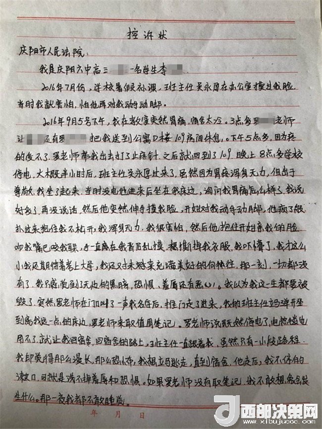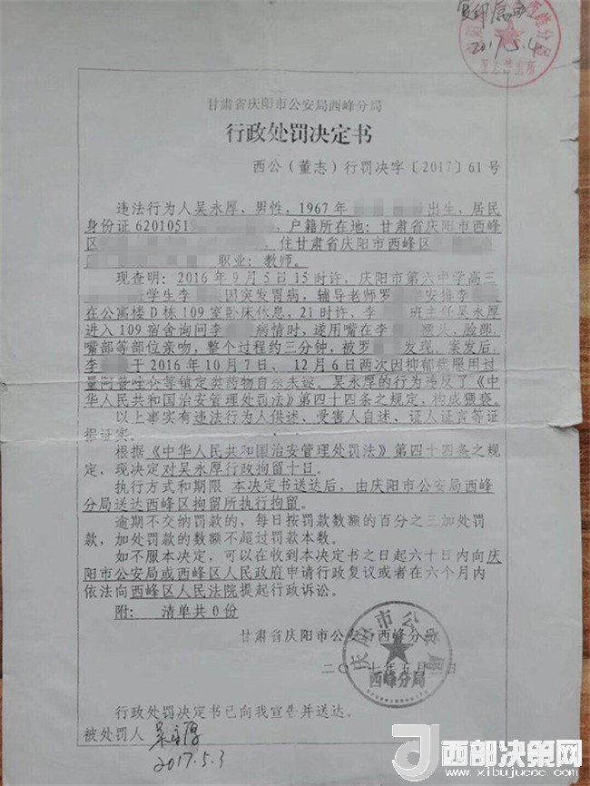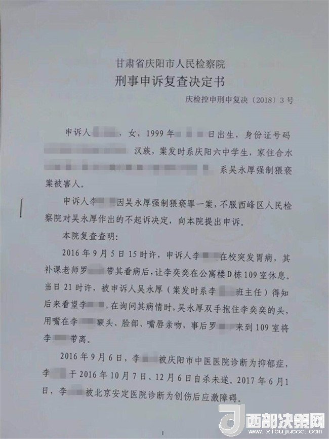 孩子叫李某奕,1999年4月出生,原慶陽六中高三(二)班學(xué)生,平時活潑開朗,勤奮好學(xué),成績在班級前列。然而,噩夢從2016年9月開始了。2016年9月5日下午,當(dāng)時正在慶陽六中讀高三的李某奕突然胃疼,因為宿舍比較冷,被老師安排在教師公寓休息。晚上8點半左右,班主任吳某厚以探病為由進入女兒休息的房間,詢問過后便開始摸臉、親吻、咬耳朵、摟抱李某奕,后因安排她休息的老師進房間取東西才停止。此后她心里就有了陰影。她先找到學(xué)校心理輔導(dǎo)老師哭訴了自己的遭遇,心理輔導(dǎo)老師解決不了,又告訴了政教主任段老師。交談中段主任得知孩子的訴求是不想見到這位涉事老師,就答應(yīng)其要求。并肯定了孩子沒告訴家長是對的。