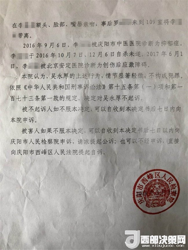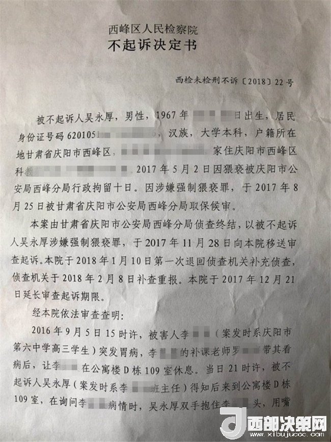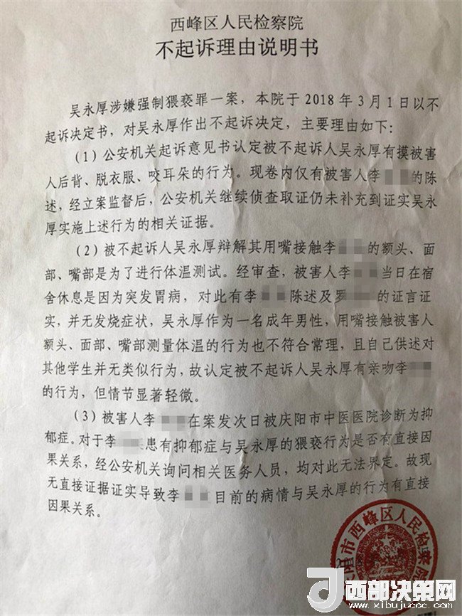 2017年2月26日,李某奕在父親陪同下到公安機關(guān)報案,稱被其班主任吳某厚猥褻,要求查處。經(jīng)辦案部門調(diào)查,2017年5月2日,公安機關(guān)依據(jù)《中華人民共和國治安管理處罰法》第四十四條之規(guī)定,以猥褻行為對吳某厚處以行政拘留十日處罰。其間,李某奕父親認為公安局處罰不當(dāng),到西峰區(qū)人民檢察院進行申訴。區(qū)檢察院調(diào)閱案卷后認為吳某厚的行為涉嫌犯罪,書面通知公安局立案偵查。公安局于2017年8月10日立為刑事案件。8月25日對吳某厚采取取保候?qū)彺胧?1月20日偵查終結(jié)后移送起訴至區(qū)檢察院。區(qū)檢察院審查后認為吳某厚的行為“情節(jié)顯著輕微,不構(gòu)成犯罪”,“決定對吳某厚不起訴”,并出具《不起訴理由說明書》。提出不起訴的三個理由,包括“公安機關(guān)繼續(xù)偵查取證仍未補充到吳某厚實施上述行為的相關(guān)證據(jù)”、“吳某厚有親吻李某奕的行為,但情節(jié)顯著輕微”、“無直接證據(jù)證實導(dǎo)致李某奕目前的病情與吳某厚的行為有直接因果關(guān)系”,于2018年3月1日作出不起訴決定。李某奕遂到慶陽市人民檢察院進行申訴。5月18日,市檢察院維持區(qū)檢察院不起訴決定。6月25日晚,據(jù)李某奕父親講,他已將申訴材料寄至甘肅省人民檢察院。