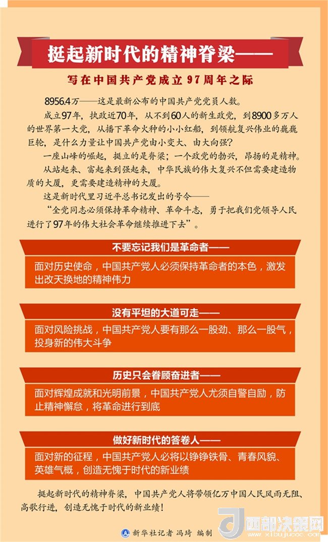 挺起新時(shí)代的精神脊梁,中國(guó)共產(chǎn)黨人將帶領(lǐng)億萬(wàn)中國(guó)人民風(fēng)雨無(wú)阻、高歌行進(jìn),創(chuàng)造無(wú)愧于時(shí)代的新業(yè)績(jī)?。ㄓ浾撸黑w承、詹勇、張曉松、謝良、周文林、陳煒偉、朱基釵、吳晶、姜瀟、王卓倫、榮啟涵)