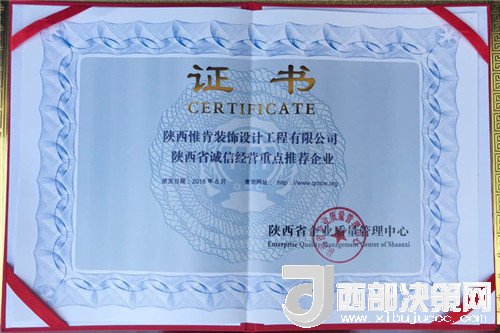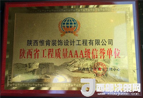西部決策網(wǎng)——西部大開發(fā)訊(帥華鋒 張曉紅)近日,寶雞市惟肯裝飾榮獲陜西省企業(yè)質(zhì)量管理中心頒發(fā)《陜西省工程質(zhì)量AAA級(jí)信譽(yù)單位》和《陜西省誠信經(jīng)營重點(diǎn)推薦單位》兩項(xiàng)榮譽(yù)稱號(hào)。