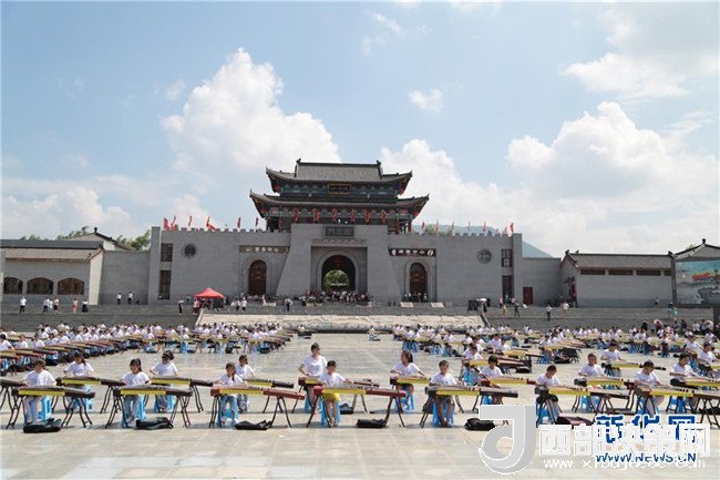 7月29日,人們在甘肅平?jīng)鲠轻脊沛?zhèn)彈奏古箏。當日,甘肅省平?jīng)鍪嗅轻脊沛?zhèn)舉行第二屆“百人箏會”,300余人共同彈奏古箏,演繹《荷塘月色》《漁舟唱晚》等曲目,聲聲悅耳,場面震撼。新華社發(fā)(鄭兵攝)