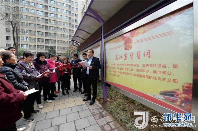 2018年3月20日,陜西寶倫律師事務(wù)所專職律師白銀濤(右一)在西安華遠(yuǎn)君城社區(qū)宣傳憲法知識。新華社記者 李一博 攝