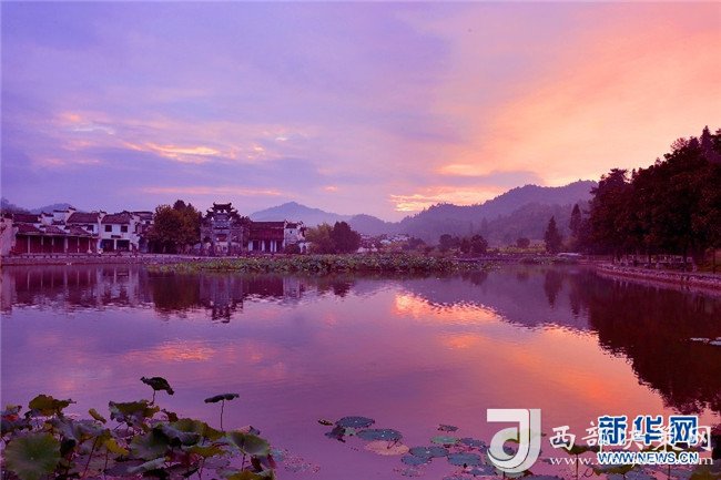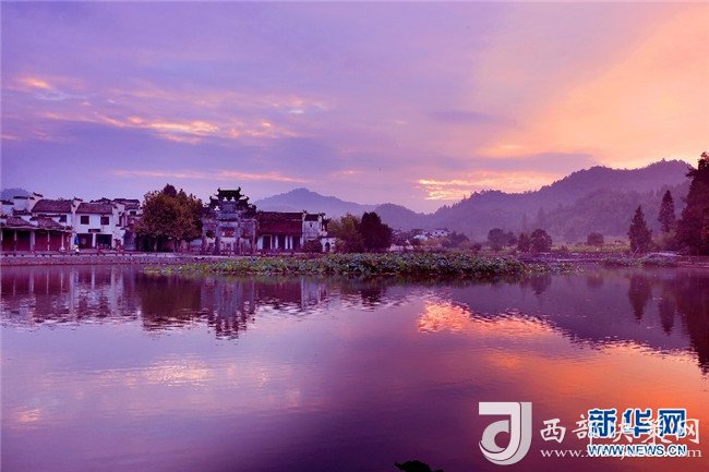8月4日,色彩絢麗的朝霞,映射安徽皖南西遞古村。