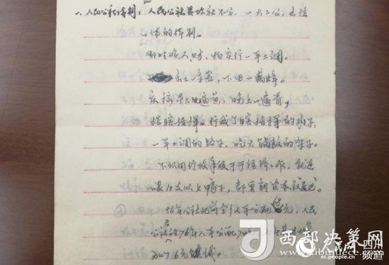 這本工作筆記內(nèi)頁紙上的字跡娟秀工整,細(xì)密地記錄著對人民公社的一些看法:“人民公社是政社不分、一大二公、五位一體的體制;出工一條龍,收工一窩蜂;不僅用行政手段干預(yù)經(jīng)濟(jì)工作,就連喂10只以上的鴨子都要割‘尾巴’……”。