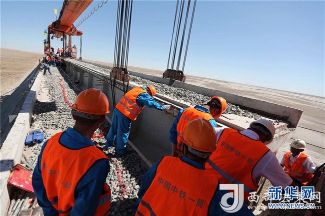 8月17日,施工人員在位于新疆若羌縣的臺特瑪湖特大橋施工現(xiàn)場作業(yè)。8月17日11時58分,在一組架橋機和運梁機的協(xié)調(diào)配合下,隨著最后一孔T型梁上的梁體精準吊裝到位,全長24.558公里、歷時2年建設(shè)的格庫鐵路(青海格爾木——新疆庫爾勒)最長鐵路橋——新疆臺特瑪湖特大橋?qū)崿F(xiàn)合龍。新華社發(fā)