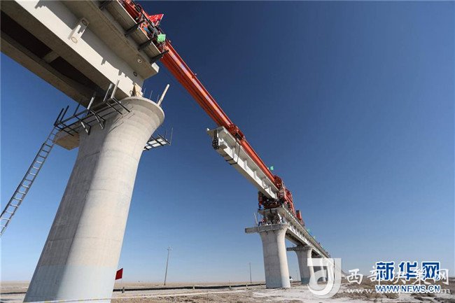 這是位于新疆若羌縣的臺特瑪湖特大橋施工現(xiàn)場(8月17日攝)。8月17日11時58分,在一組架橋機和運梁機的協(xié)調(diào)配合下,隨著最后一孔T型梁上的梁體精準吊裝到位,全長24.558公里、歷時2年建設(shè)的格庫鐵路(青海格爾木——新疆庫爾勒)最長鐵路橋——新疆臺特瑪湖特大橋?qū)崿F(xiàn)合龍。新華社發(fā)
