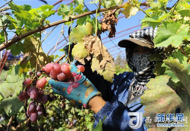 8月22日,在中衛(wèi)市沙坡頭區(qū)一家生態(tài)養(yǎng)殖基地,工作人員在采摘葡萄。該養(yǎng)殖基地經(jīng)改造沙漠建成,占地500余畝,目前已發(fā)展葡萄種植、肉牛、奶牛養(yǎng)殖等產(chǎn)業(yè)。新華社記者任鵬飛攝