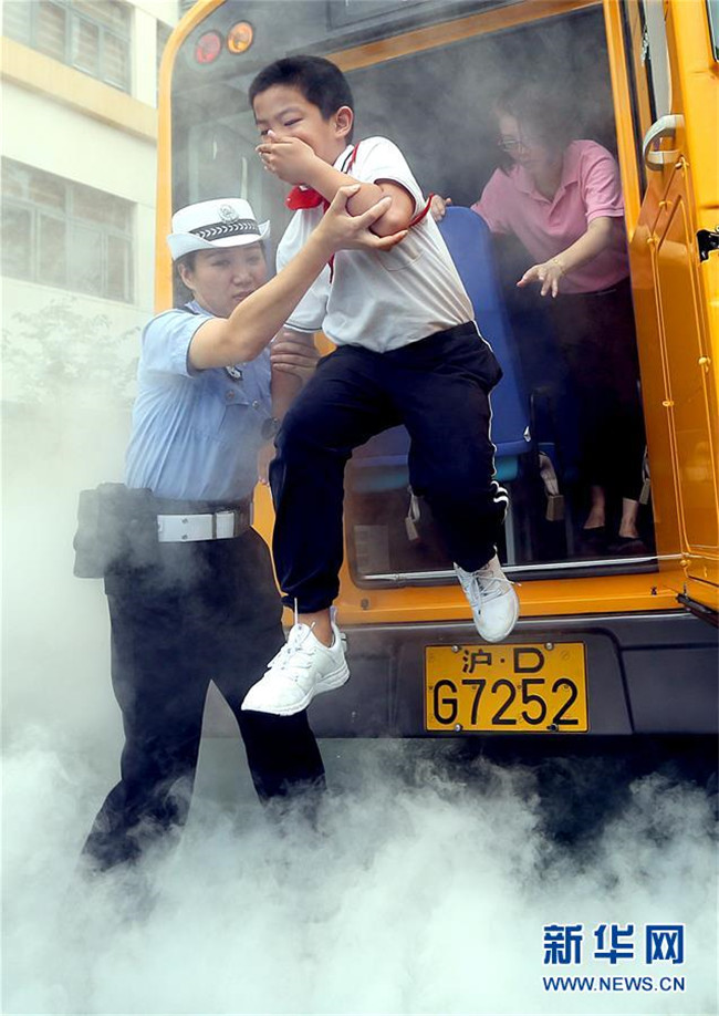 9月3日,民警在校車應急疏散演練環(huán)節(jié)指導小學生從“起火”的校車中緊急疏散。
