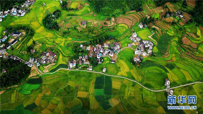 廣西隆林各族自治縣克長(zhǎng)鄉(xiāng)海長(zhǎng)村的秋稻即將成熟(9月1日無(wú)人機(jī)拍攝)。 新華社記者張愛林?jǐn)z