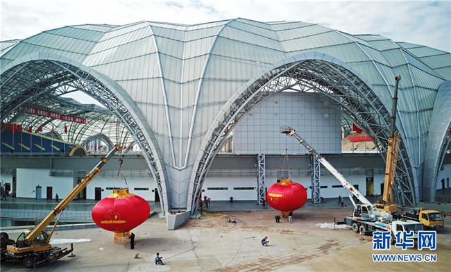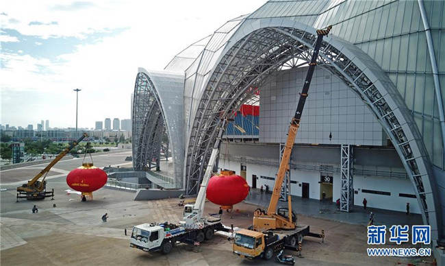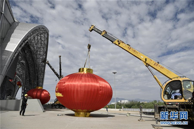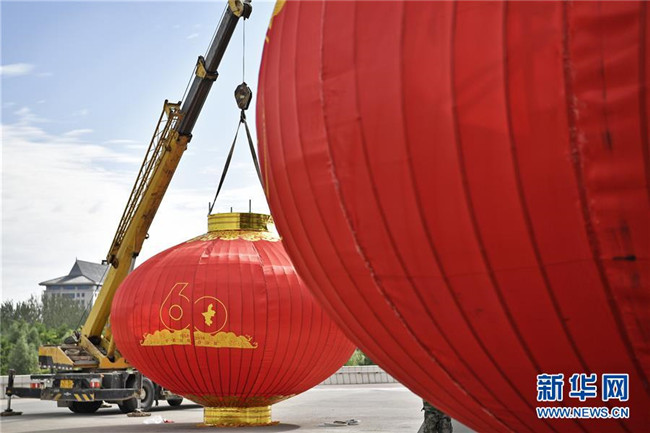 9月4日,工人在賀蘭山體育場吊裝紅燈籠。