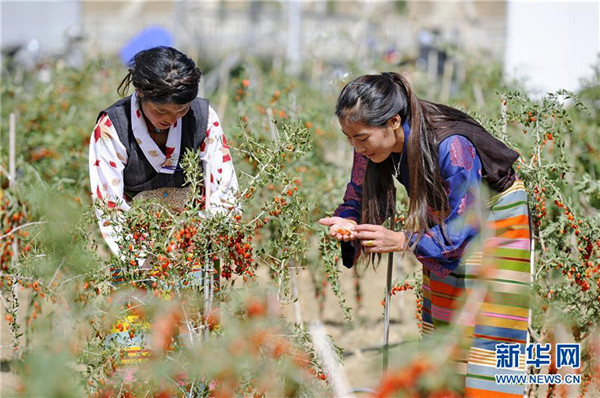 近日,西藏白朗縣萬(wàn)畝枸杞生態(tài)觀光產(chǎn)業(yè)園進(jìn)入采摘期。兩年多來(lái),經(jīng)過(guò)當(dāng)?shù)卣推髽I(yè)的共同努力,將原有的沙荒地進(jìn)行改造,成功栽培7000余畝枸杞目前已果實(shí)累累。 新華社記者 張汝鋒 攝