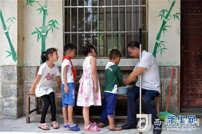午飯開飯前,高自仁幫助孩子們洗手(9月3日攝)。新華社記者 彭昭之攝