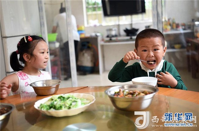 學生在吃高自仁做的午飯(9月3日攝)。新華社記者 萬象攝