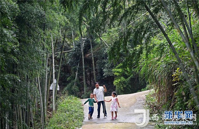 高自仁(中)帶新入學的新生去學校附近的竹林參觀,讓孩子們熟悉環(huán)境,了解大自然(9月3日攝)。新華社記者 萬象攝