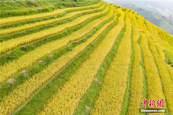 金秋時節(jié),貴州省榕江縣計劃鄉(xiāng)陽開梯田水稻進入成熟期,金黃色的梯田構成了一幅美麗的秋天圖景。