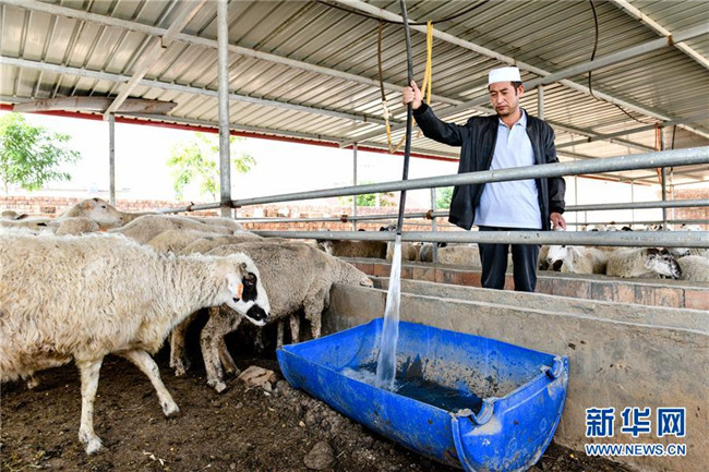 在中寧縣喊叫水鄉(xiāng)賀家口子村,養(yǎng)殖戶賀學(xué)銀在給羊喂水(9月6日攝)。新華社記者 郭緒雷 攝